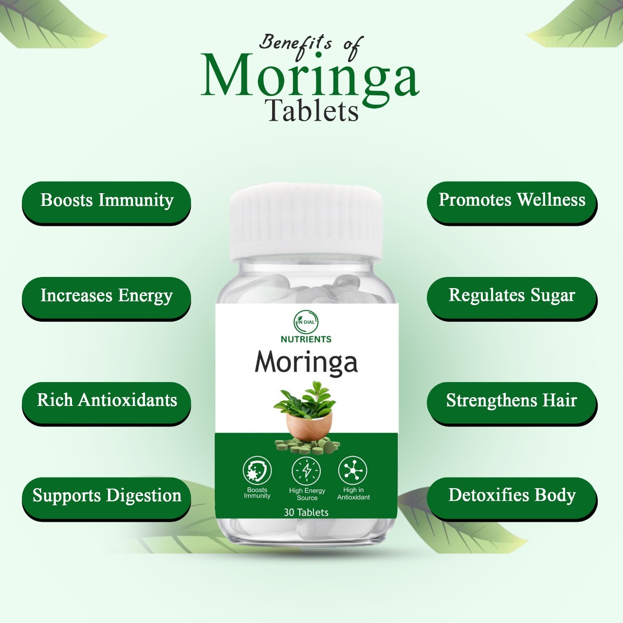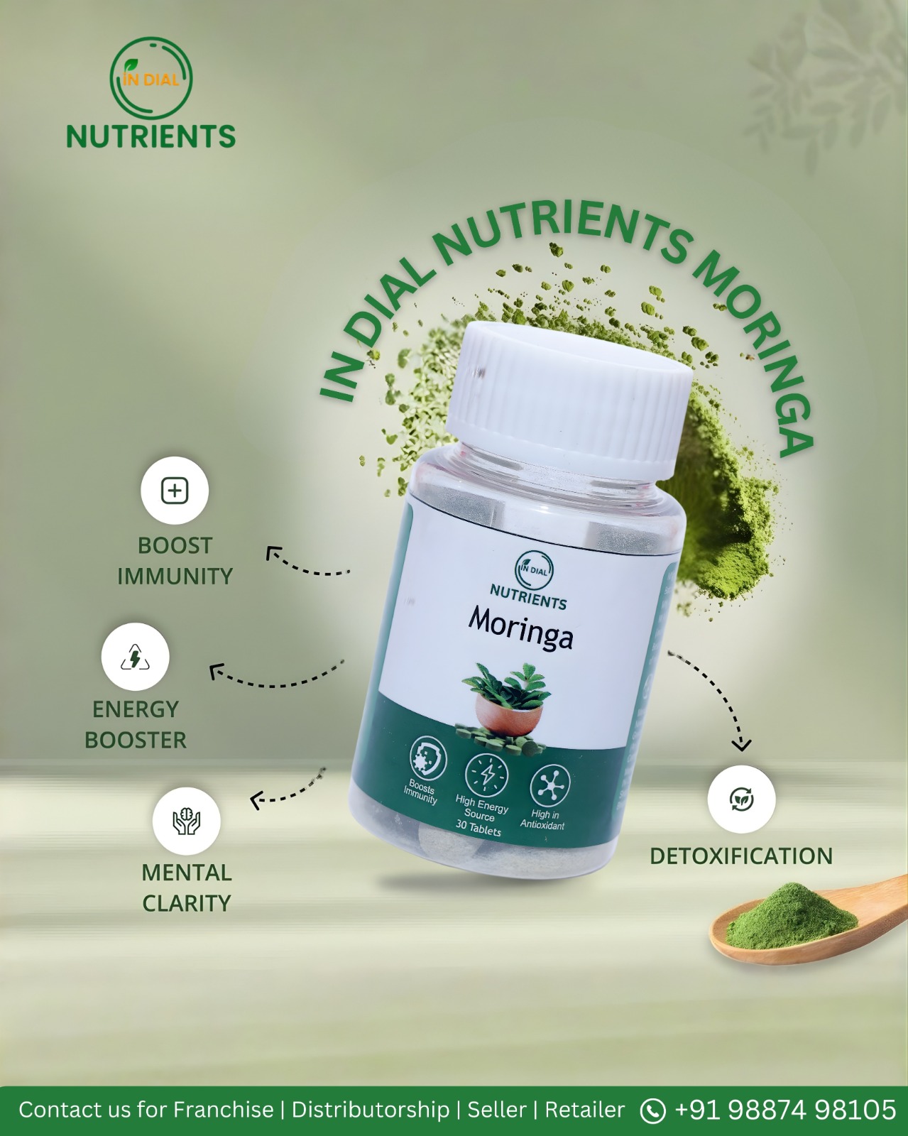 Boost your daily wellness with In-Dial Nutrients Moringa Tablets, made from nutrient-rich Moringa — widely known as nature’s superfood. Packed with essential vitamins, minerals, and antioxidants, this Ayurvedic supplement helps support immunity, maintain energy levels, and promote overall health.